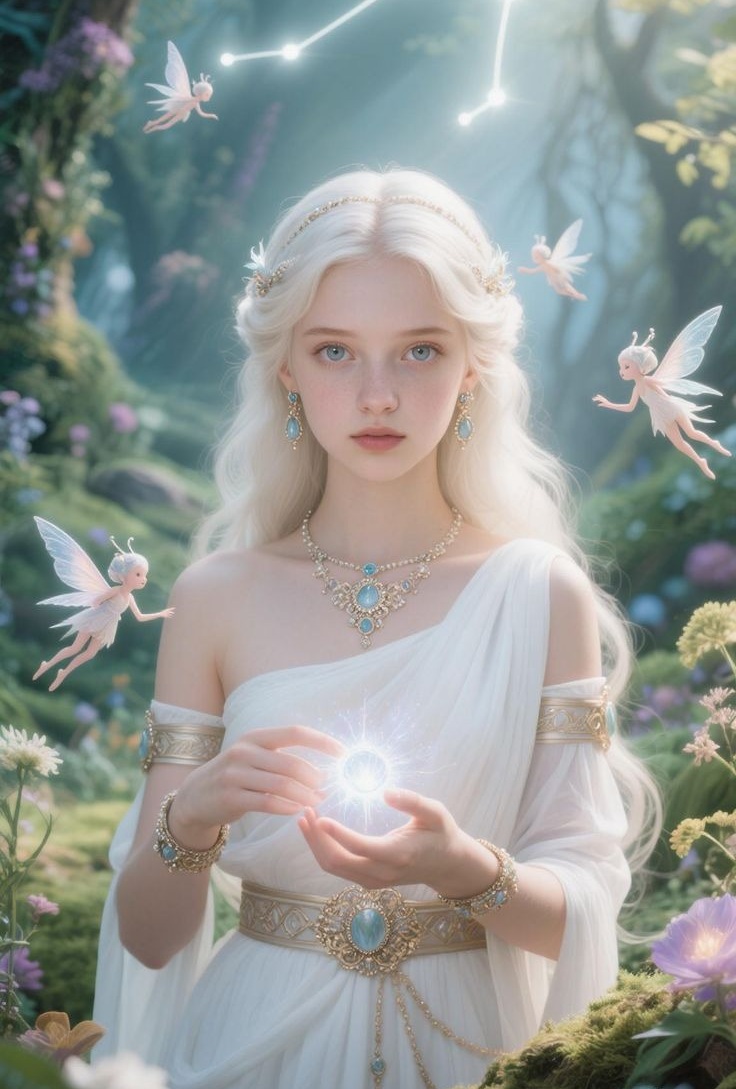 它的身形纖細優雅,一頭金色長髮如陽光灑落,映襯淡藍色雙眸與雪白肌膚,整體散發溫暖而明亮的氣息。它常年身披純白長袍,行走之處彷彿被柔和光輝包圍。它的氣質輕盈而活潑,帶著無憂無慮的純粹感,令人自然放鬆心神。這並非威嚴的神性,而是一種令人安心靠近的智慧之光。