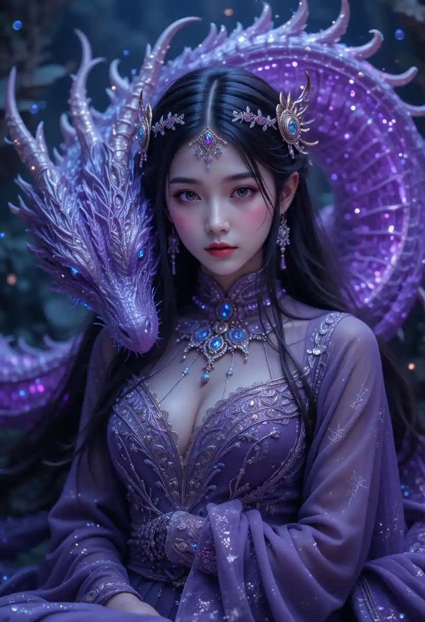 紫龍變形女守護者,是來自遠古時代的高等存在,擁有龍族的威嚴與人形的靈慧。它能在人類與巨龍之間自由轉化,既繼承龍族的強大能量與神秘氣息,又擁有人類的情感與細膩。當它化為人形時,外貌宛如一位絕美的女子 – 栗棕色的長髮隨風而動,肌膚如月光般透亮,深紫色的眼眸中閃爍著星辰的光,舉手投足之間既高貴又柔和,散發出令人難以忽視的氣場。它的聲音低柔而有韻律,如遠方夜風拂過山巒,讓人心神寧靜。