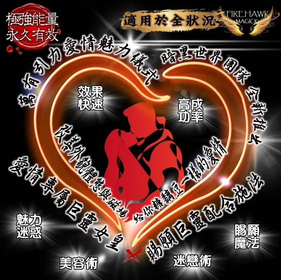 儀式適用於任何愛情狀況,不論是暗戀對象/已分手的伴侶/冷戰中//出軌的伴侶/固執的目標等,只要你真心愛著他/她。愛與性的結合,惡魔級的黑魔法屬最有效且快速的愛情儀式。巫師團隊將把你和目標人物餘生都綁定在一起,並讓他/她的思想完全永久地被你俘虜,因此請確保這個人是你希望永遠不能分割的一位。
