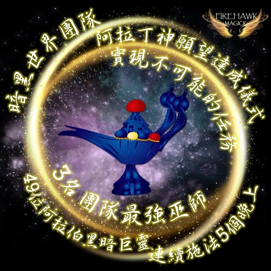 這是一個自訂的願望達成儀式,你可以根據自己需要並告訴我們你所需。此儀式為團隊中非常有名和非常重視的儀式;儀式將由團隊中最擅長與巨靈合作,最有經驗的巫師負責,並與多達49位全黑巨靈合作,儀式將連續施放5晚,確保發揮最強功效,即使是人人覺得不可能的任務,巫師都有信心為你達成。