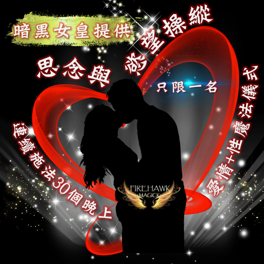 儀式將連續進行30天,當中包括能量倍增的新月夜和滿月夜,暗黑女皇將聯同整個團隊為你施法。儀式能量將重點打擊目標的情緒,敲響他/她內心對你的情感,目標將若有所失,茶飯不思,甚至感到折磨,直到他/她醒覺你的重要性,而你將是他/她唯一不可取替的解藥。同時,儀式將令他/她將對身邊其他異性不再感興趣,你是他/她唯一想得到的人,此能量亦適用於防止伴侶出軌。