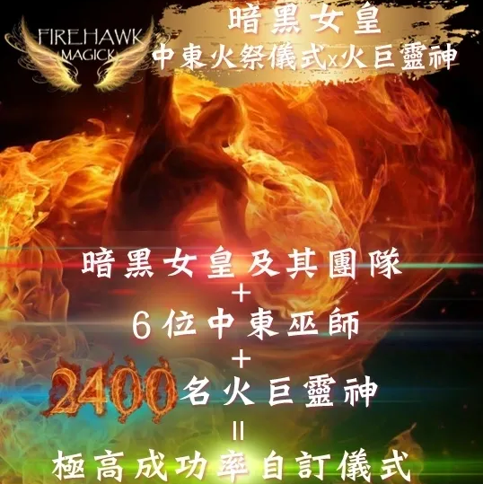 此為自訂儀式,有非常大的彈性並能充分按你個人需要去施法。儀式由暗黑女皇及其團隊,連同6位中東巫師和2400各火巨靈共同施法。一眾巫師將連續24小時為你進行儀式,並透過喚醒火原素神靈及一眾火巨靈神合力將儀式能量推至頂峰。