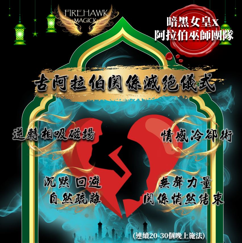 「暗黑女皇」與阿拉伯巫師團隊為你帶來全新古阿拉伯儀式 – 此儀式專為瓦解特定關係而設,亦即用於驅離第三者的高階能量儀式。